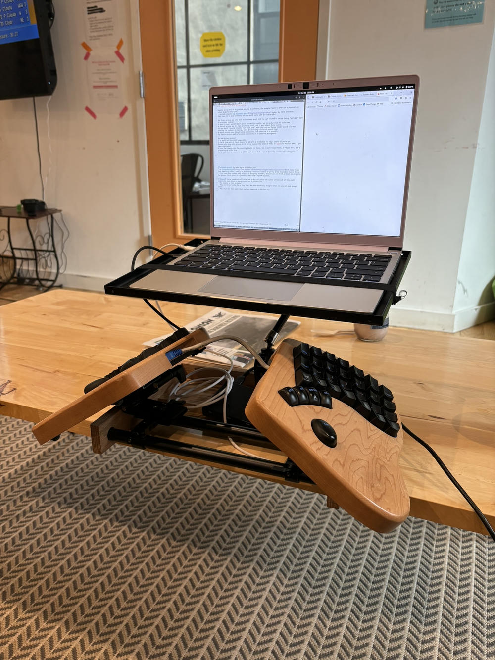 Despite doing most of my problem solving in software, the example I want to share is a physical one (which inspired this post). I recently rebuilt my ergonomic setup again, my fifth iteration. This time, it is made of mostly off-the-shelf parts with one custom part.